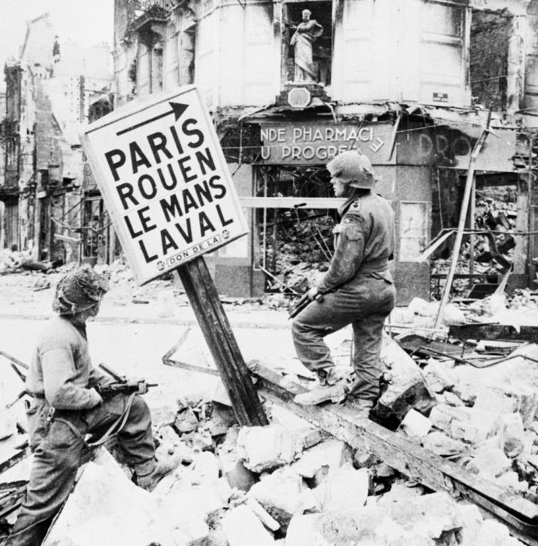At 0930 hrs on 9 July 1944, as the final phase of a Brigade attack, 2 RUR with B Company leading, advanced slowly into the battered ruins of the town. Systematically, and with guides from the local French resistance, the Battalion located and dealt with snipers and small groups of retreating enemy; it found no organised resistance, although D Company did receive two casualties.