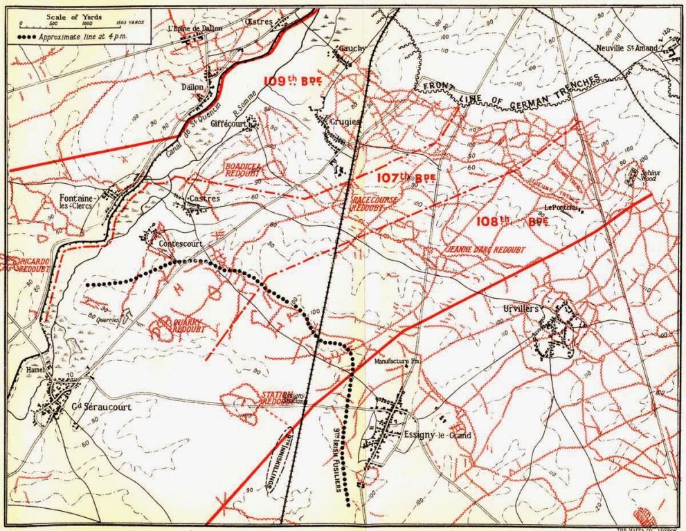 Among the Irish infantry facing the German spring offensive were the 1st, 7th, 8th and 9th Battalion The Royal Inniskilling Fusiliers; the 1st, 2nd, 12th and 15th Battalion The Royal Irish Rifles and the 1st and 9th Battalion The Royal Irish Fusiliers; the 1st Battalion The London Irish Rifles in another area bore the brunt of a German attack supporting Operation MICHAEL around St Quentin.