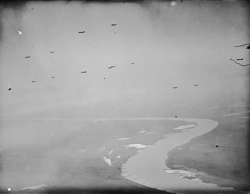 Royal Air Force Short Stirling aircraft tow Horsa troop-carrying gliders over the Rhine during Op VARSITY to land east of the river.©