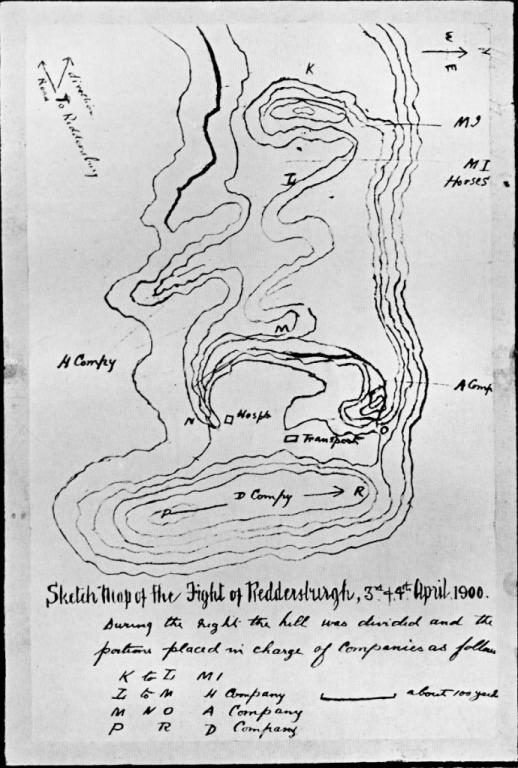 On 3 April 1900, Captain McWhinnie and a column were on duty proclaiming the Queen's Peace and accepting the surrender of Boer farmers in the area of Reddersberg. When unexpectedly threatened by a large Boer Commando, Captain McWhinnie and his three rifle companies and one mounted company of the 2nd Battalion The Royal Irish Rifles (and one attached mounted company of the 5th Fusiliers), adopted a defensive position on a nearby feature which was too large for his small force to defend.