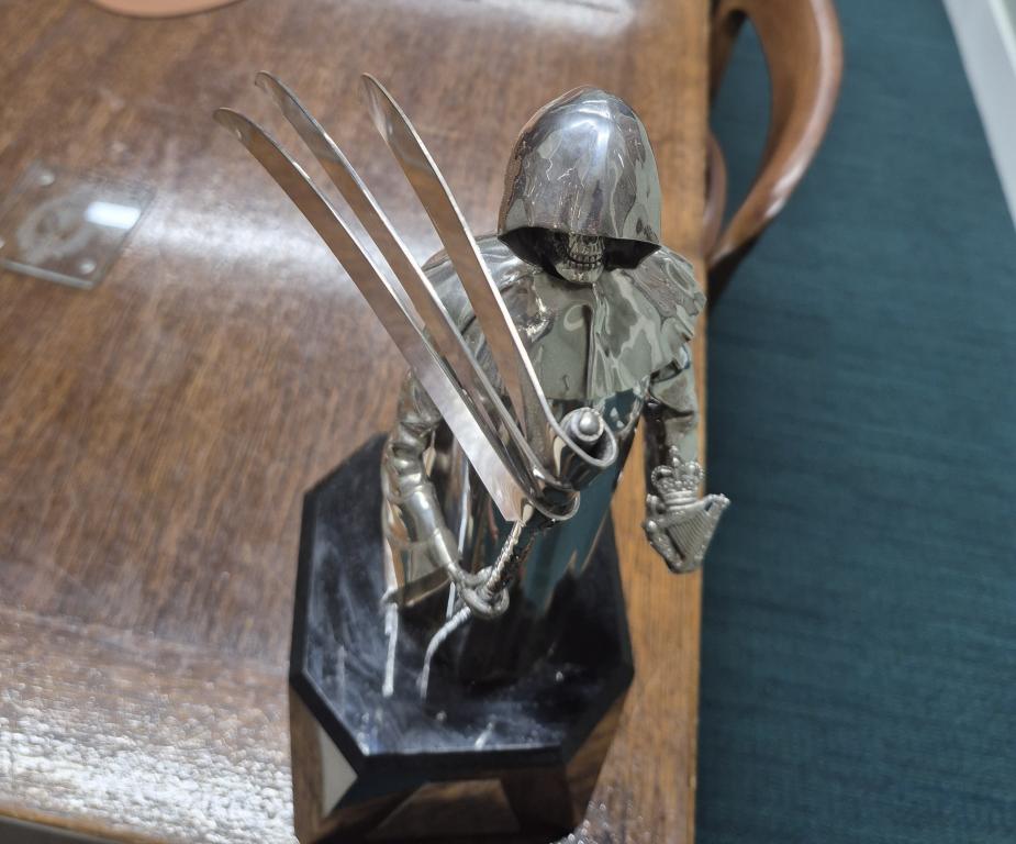 The piece was created by the renowned silversmith, Graham Harron of Hillsborough and the image was inspired by a 16th century painter, Hans Holbein, with alterations intended to give it a special military significance. Holbein's original series of woodcuts were inspired by 'death ad the ever present companion of life'. The Grim Reaper’s scythe has three blades to signify the 3rd Battalion, while in his left hand, he carries the cap badge of The Ulster Defence Regiment. The panels on the sides of the plinth name the officers who were still serving in the Battalion at the time of the merger and were responsible for commissioning the piece. The narrative of the sculpture is that of the Grim Reaper carrying off the 3rd Battalion The Ulster Defence Regiment into eternity.