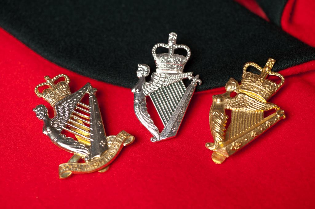 The new Royal Irish Regiment cap badge (centre) with Rangers (left) and UDR (right).