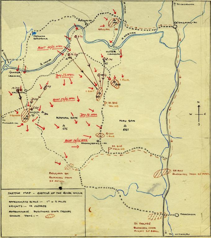 Owing to the perilous state of 29 Brigade's left flank, it was in danger of being surrounded. Therefore, on 25 April, the 1st Battalion The Royal Ulster Rifles received orders to withdraw. Having vacated its position, the Battalion prepared to move via Route 11 to the southwest and then withdraw with the Brigade down the Main Supply Route (MSR) on Route 33.