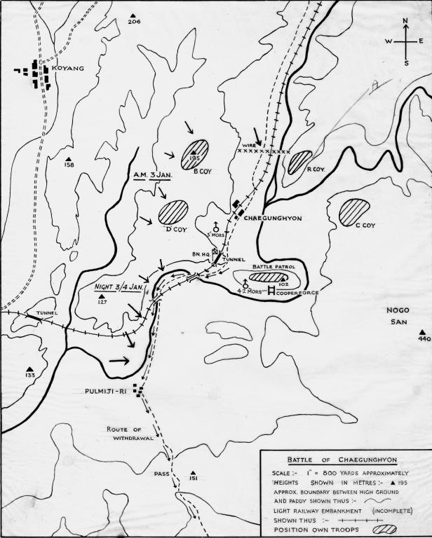 The Battalion's position was sited in low hills covering a track and river bed which led in from the north-east and joined the main road to Seoul about four miles further south. The village of Chaegunghyon itself was roughly in the centre of the position, while on the Battalion's right flank was the rugged mountain mass of Nogo San, some 440 metres high. B and D Companies were allotted the high ground to the west of the valley, while A and C were slightly forward and on the east. Battalion H.Q. and A Echelon were sited in and around the mouth of a short railway tunnel, and a small saddle just east of the tunnel was occupied by the Battle Patrol and three troops of Cromwell tanks in a depth blocking position.