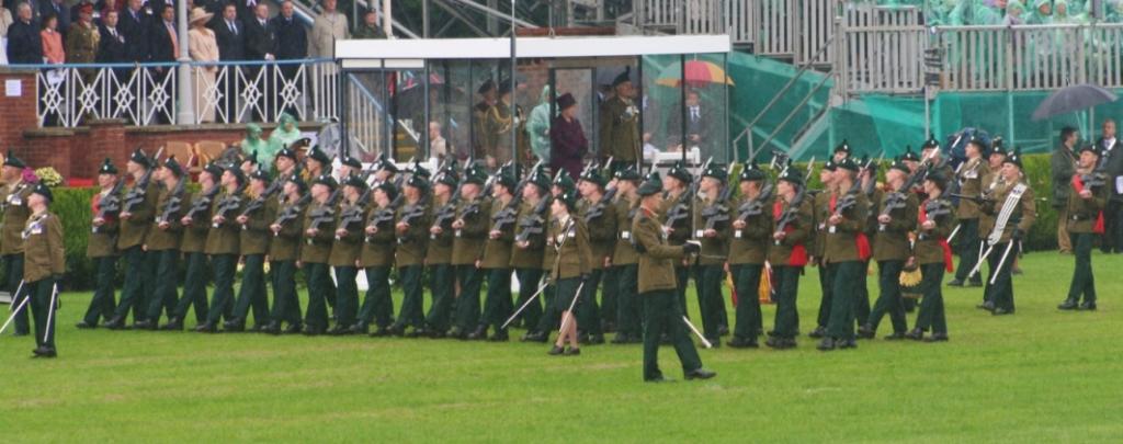 On parade were the Regimental Colonel, Colour Parties and Guards from the 2nd, the 3rd and the 4th Battalion The Royal Irish Regiment, and a Guard from the Regimental Associations of The Ulster Defence Regiment along with the Band, Bugles, Pipes and Drums and the Regimental Mascot, Brian Boru. Rain began to fall as The Queen arrived and continued throughout the parade. Senior officers, many of whom had served with the Regiment, dignitaries from all walks of life, members of the associations, families and bereaved families watched as The Queen inspected the parade. The high point of the parade was the presentation of the Conspicuous Gallantry Cross which was received by Corporal Clare Withers on behalf of the Regiment. This was followed by an immaculate march past in slow and quick time before the Regimental Colonel sought permission from The Queen to 'March off' for the final time.