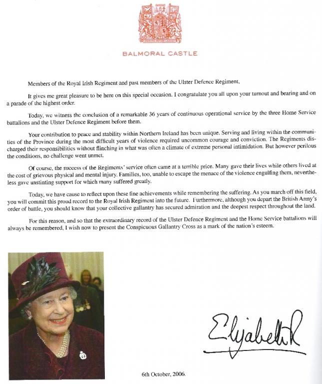 On the 6 October 2006, Her Majesty Queen Elizabeth II awarded The Royal Irish Regiment the Conspicuous Gallantry Cross in recognition of the bravery, sacrifice and service of the Home Service battalions of The Royal Irish Regiment and their forebears, The Ulster Defence Regiment.
