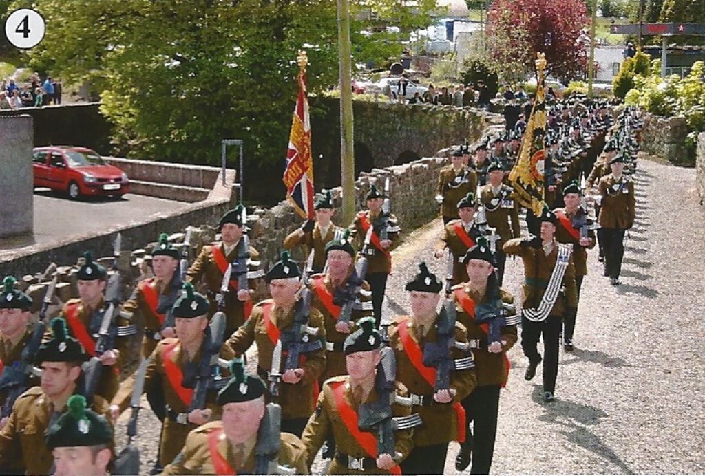 After the parade, The Queen and The Duke of York met many members of the regimental family including the widows, bereaved parents and disabled former members of the Regiment. Over lunch, the Colonel of The Regiment presented The Queen with a white gold brooch fashioned after the regimental crest and encrusted with diamonds. Thus ended both a proud and sad day for the Regiment as the Home Service Battalions marched off into history with the Conspicuous Gallantry Cross emblazoned on the Regimental Colours of The Royal Irish Regiment.